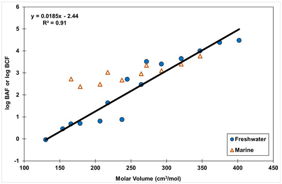Numerous studies have investigated the uptake of PFAS by plants or animals. Several of these studies have shown that bioconcentration factors exhibit correlations to PFAS chain length [21,22,23,36,37,38,39,40]. To illustrate the application of QSPR analysis to such data, a model is presented in Figure 6 for uptake of several PFCAs and PFSAs by several freshwater fish species. The model provides a reasonably good representation of the data. Notably, the slope of the QSPR function for the data set is essentially identical to the slope of the QSPR model for air–water interfacial adsorption (Figure 5). Given that air–water interfacial adsorption is governed by the hydrophobic-interaction mechanism, the similarity in slopes suggests that uptake of PFAS by fish is also mediated to some degree by hydrophobic interaction.