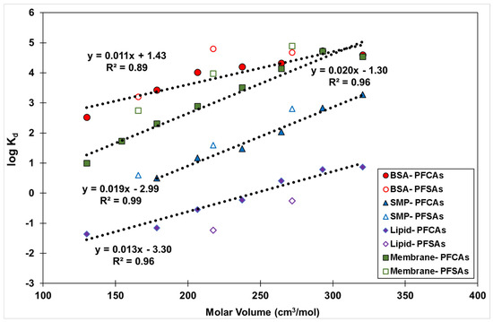 Measured distribution coefficients for interaction of PFAS with different biological constituents. BSA = bovine serum albumin, SMP = structural muscle protein, membrane = phospholipid membrane. Data compiled from the following sources: [53,54,55,56,57,58]. The regression lines are developed for the PFCA data only.
