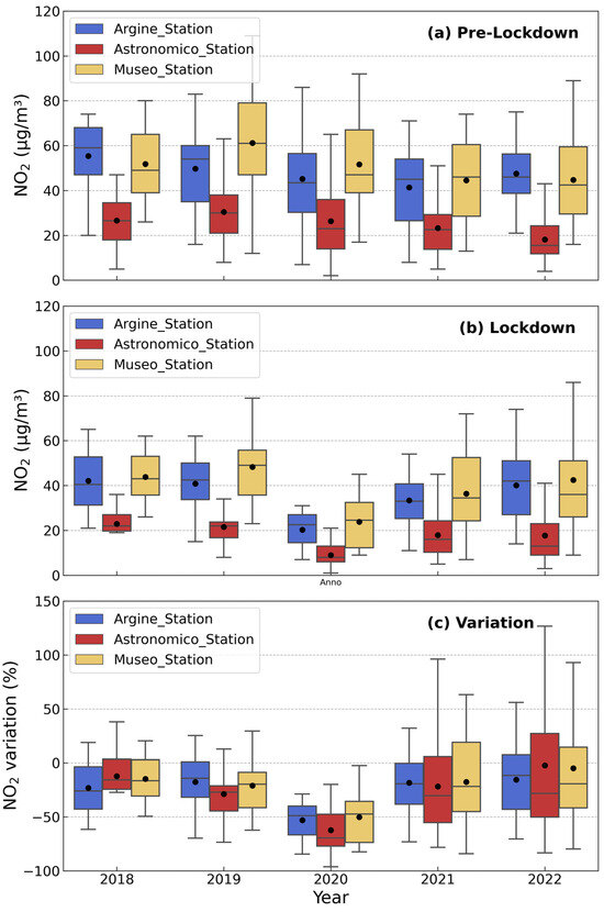 Daily averaged values of the NO2 concentration as a function of the year for the pre-lockdown (panel (a)) and lockdown (panel (b)) periods and relative variation (panel (c)) as registered at the three sampling stations: Argine (blue), Astronomico (red), and Museo (yellow). The central line inside the box is the median, while the black dot is the mean. The box spans from the 1st quartile (Q1) to the 3rd quartile (Q3), showing the middle 50% of the data, while whiskers extend from the smallest to the largest values within 1.5 times the IQR, defined as the length of the box.