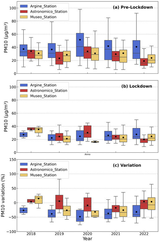 Daily averaged values of the PM10 concentration as a function of the year for the pre-lockdown (panel (a)) and lockdown (panel (b)) periods and relative variation (panel (c)) as registered at the three sampling stations: Argine (blue), Astronomico (red), and Museo (yellow). The central line inside the box is the median, while the black dot is the mean. The box spans from the 1st quartile (Q1) to the 3rd quartile (Q3), showing the middle 50% of the data, while whiskers extend from the smallest to the largest values within 1.5 times the IQR, defined as the length of the box.
