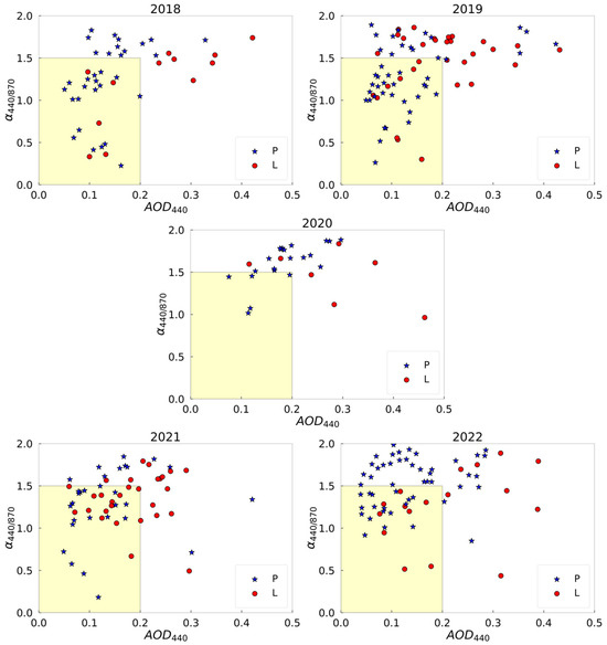 Figure 3 highlights the absence of data for the period L of the lockdown year 2020 in the yellow box identified by the extremes 0 ≤ AOD ≤ 0.2 and 0 ≤ α ≤ 1.5 as compared to the other four years (2018, 2019, 2021, and 2022). Differently, the yellow box is populated by 19 points for the P period and 5 points for the L one in 2018, 27 points in P-2019 and 9 in L-2019, 18 points for P-2021 and 14 for L–2021, and 17 points in P-2022 and 9 in L-2022. The highlighted range corresponds to atmospheric conditions characterized by large particles (lower α values), generally associated with local soil particle uplift and polluted marine aerosol components, and large and fine anthropogenic particles, associated with vehicle emissions and anthropogenic activities [54,55]. The figure evidences an almost total reduction in a particular aerosol component whose origin can be ascribed to anthropogenic activities [26]. The recovery of such an aerosol component is also reflected in the volume size distribution, as illustrated hereafter.