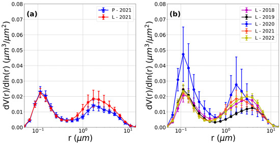 Also in this case, the data referring to the days affected by dust events were removed, and the daily distributions were averaged over the observation periods. Prior to illustrating the data, we recall that in 2020, an almost threefold increase in the fine aerosol component was observed in the Naples urban area as a characteristic feature of the changes occurring in the period of the lockdown L with respect to the previous P one [26]. Interestingly, in the year 2021, the average size distributions for the two periods P and L shown in Figure 4a are indeed consistent within the experimental uncertainties. The two curves show very similar features for both fine and coarse particles, suggesting the absence of significant changes in the two observational intervals. A similar coherence of the average size distributions in the two periods was also observed for the years 2018, 2019, and 2022, thus suggesting that the peculiar behavior observed in 2020 can be reliably ascribed to the effects induced by the pandemic lockdown. The increase in the fine aerosol component in the atmospheric column during the lockdown in the year 2020 is clearly discerned in Figure 4b, which reports the size distributions observed in the five different years for the L interval. The fine component for the pandemic year 2020 appears markedly different compared to the other four years (2018, 2019, 2021, and 2022), whose features instead have very similar results. The curves clearly evidence a remarkable change in the finer fraction of the aerosol, whereas for the coarser part, the variation is lower and referable to statistical fluctuations. This observation puts into evidence an unexpected change in the atmospheric aerosol composition in the period of the lockdown, with a predominance of the finer aerosol fraction.