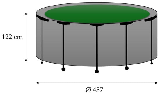 The experiment was conducted at a white pig farm in Fuente Alamo, a municipality in the Murcia region of southeastern Spain. It was conducted from 18 April to 22 June 2023. The pilot study aimed to replicate the conditions of swine manure storage tanks. A portable pool with a steel and PVC structure, purchased from Bestway®, España, Spain (ref. 84265026), made in China, with circular dimensions of Ø 457 × 122 cm was used Figure 1. The slurry was divided proportionately among the experimental pools, resulting in each pool being filled up with 13 m3 of slurry at a depth of 1 m. The chosen volume was determined to meet the requirements of the VERA protocol []. To implement the study on a real-world scale, we had three pools, two were treated with the same quantity of the biological additives (HIPO-PURIN), one pool with OXI-FUCH aeration techniques and the other one without, while one pool remained untreated as a control. The slurry composition and gaseous emissions were continuously tracked throughout the experiment.