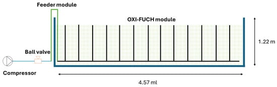 In this study, we explored the potential of enhancing HIPO-PURÍN with an aeration system composed of linear modules of pipes, known as OXI-FUCH modules Figure 2. These modules consist of two interconnected pipes: an upper micro-perforated pipe facilitating aeration by generating two columns of microbubbles, and a lower pipe filled with sand to serve as ballast for deposition at the reservoir bottom. The microbubbles thus produced traverse the slurry from bottom to surface at a slow and uniform pace, transferring oxygen through friction. This oxygen acts as an energy source for sustaining and promoting the growth of bacteria present in HIPO-PURÍN. Our methodology involved transforming the storage tank into a miniature treatment plant by implementing these OXI-FUCH modules. The design of these modules is crucial, as it prevents the merging of air flows, thereby preventing the formation of large bubbles. This design feature promotes the efficient transfer of oxygen, with microbubbles facilitating up to 6.6 times more oxygen transfer compared to large bubbles, due to their increased contact surface area with the water. The operation of the compressor in this study was structured with a continuous operation time of 20 h, followed by a continuous off-time of 5 h.