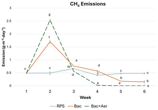 Methane (CH4) progression of untreated and treated pig slurry (RPS: raw pig slurry, Bac: treated pig slurry with bacteria, Bac + Aer: treated pig slurry with bacteria and aeration). Different letters indicate significant differences between the sampling times and treatments (p < 0.05).