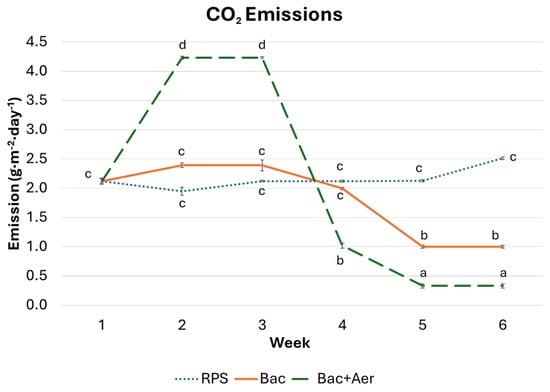 Carbon dioxide (CO2) progression of untreated and treated pig slurry (RPS: raw pig slurry, Bac: treated pig slurry with bacteria, Bac + Aer: treated pig slurry with bacteria and aeration). Different letters indicate significant differences between the sampling times and treatments (p < 0.05).