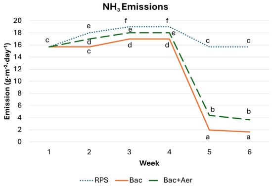 According to results shown in Figure 5, similar curves were observed for NH3 during the first, third, and fourth weeks for the control and treated pig slurry. Following the initial treatment, the control and treated slurry reported significant increases (p < 0.05) during the three weeks previously indicated, and the values for the controlled slurry decreased in the fifth week then settled in a constant range, with the same behavior for the other treatments. NH3 emissions significantly (p < 0.05) decreased when comparing control and pig slurry treated with bacteria (15.66 mg·m−2·day−1 compared to 1.667 mg·m−2·day−1, respectively). The same effects were seen when comparing the treated slurry with bacteria coupled with aeration (3.66 mg·m−2·day−1). In this study, we observed that NH3 was less reduced under aerobic conditions compared to the treated slurry when only adding bacteria. The difference in the reduction in ammonia emissions between using the additives alone (90%) and combining them with aeration (76%) could be due to the specific mechanisms involved in each approach.