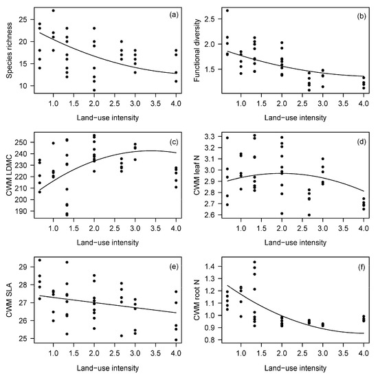 CWM LDMC and CWM leaf N were quadratically related to land-use intensity (Figure 2c,d). While CWM LDMC increased up to a land-use intensity of approximately three and then decreased slightly, CWM leaf N was highest at intermediate levels of land-use intensity at approximately two. CWM root N and CWM SLA decreased with increasing land-use intensity, the latter linearly (Figure 2e,f). The proportion of herbaceous species declined sharply with increasing LUI, especially the proportion of herbaceous legumes (see Figure S2, Supplementary Materials).