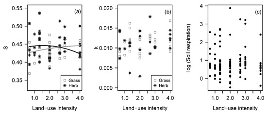 Effects of land-use intensity on belowground processes. Stabilisation S (a) and the decomposition constant k were assessed using the tea-bag method, with tea bags buried under grassy patches (grey squares and lines) or herbaceous patches (black stars and lines) Soil carbon dioxide efflux (µmol m−2s−1) (c) was assessed using a LICOR and data were log-transformed to improve residual distribution (no significant effects found in (b,c)). In (c) dots represent all measurements (i.e., comprise herbs and grasses).