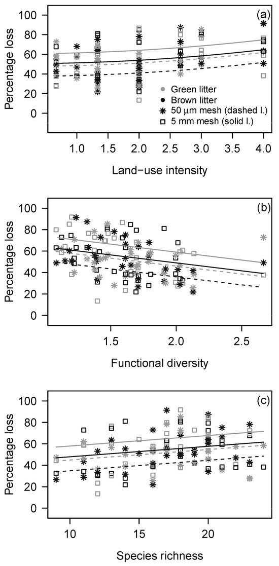 We found generally faster decomposition of green litter when macrofauna had access, but without any interactions between these factors and land-use or plant community composition. This implies that the decomposition of green, living litter is governed by the same factors as the decomposition of senesced, brown material in grassland [61,67]. Further, soil macrofauna reacts in a similar way to litter quality and land-use intensity as microfauna. Similarly, Yin et al. [63] found that grassland management intensity did not affect soil faunal contribution to litter decomposition.