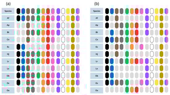 Suspected microplastic colors by species for GI samples (a) and muscle samples (b). From left to right the colors are black, blue, brown, gray, green, orange, red, pink, purple, transparent/white, yellow, yellowed, and multi-colored. From top to bottom the species are Af: hardhead catfish (Ariopsis felis); Ap: sheepshead (Archosargus probatocephalus); Bt: menhaden (Brevoortia tyrannus); Cn: spotted seatrout (Cynoscion nebulosus); Es: ladyfish (Elops saurus); Hj: scaled sardine (Harengula jaguana); Lr: pinfish (Lagodon rhomboides); Lx: spot (Leiostomus xanthurus); Ob: Gulf toadfish (Opsanus beta); Oc: pigfish (Orthopristis chrysoptera); and Oo: Atlantic thread herring (Opisthonema oglinum).