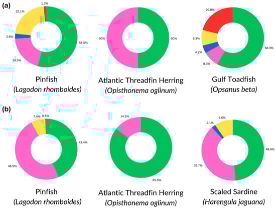 Additionally, our findings of microplastics in these fish are concerning for seafood safety. In 2021, Florida was ranked 11th in the United States for the highest production of fresh seafood, accounting for 4.2% of the national total value [104]. The species examined in our study hold commercial value or are sought after for sport fishing [105]. The most contaminated species in our study, the pinfish, is commonly used as bait fish in both commercial and recreational fishing [106,107]. Through trophic transfer, these larger commercial species, such as spotted seatrout, could become contaminated, thereby increasing exposure risk for seafood consumers [108].