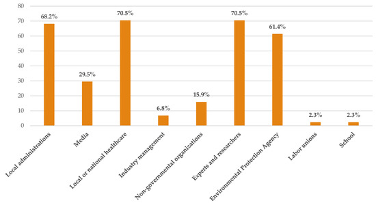 In relation to the previous question, citizens were asked whom they would like to be informed by about environmental and health risks in their area of residence. It was seen that subjects preferred to be mainly informed on these topics by experts and researchers (70.5%) or by local or national healthcare representatives (70.5%), then by local administrations (68.2%) and environmental agencies (61.4%), demonstrating that citizens had confidence in these authoritative sources of information (Figure 4).