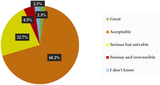 In accordance with Figure 3 results, regarding the environmental situation of the municipality in which they lived, 68.2% of people considered the situation acceptable and 22.7% serious but solvable (Figure 5), revealing a larger, but probably superficial, knowledge of the local environmental issues.