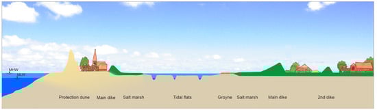 Historically, salt marshes were primarily used for agricultural purposes []. In order to expand the area, salt marshes were created through engineering for a considerable period of time [,,]. For more than a century, the function of salt marshes for the mainland coast in CFERM was recognised as important [,,,], as already noted by Brahms [] in 1754/1757. In the recent past, the focus of salt marsh management has shifted due to the increasing importance of nature conservation [,]. CFERM increasingly integrates nature-based solutions (NBS) [,]. In Lower Saxony, salt marshes are an essential element of flood risk management [,].