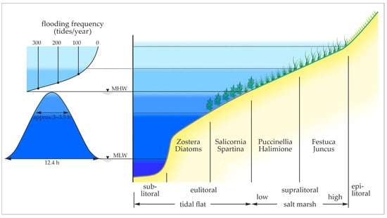 Tidal flats and salt marshes with their plant communities depending on the duration and frequency of flooding as well as their ecological structure (changed after []).