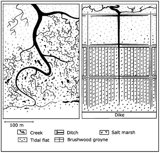Drainage systems are used for a multitude of purposes: in groyne fields, drainage furrows and ditches are used to promote the development of pioneer vegetation [,]. Nowadays, drainage systems in the salt marshes near the dike serve to ensure adequate drainage of the dike foot [,,,] and to allow grazing for management [] and also for nature conservation purposes []. Artificial drainage systems differ from naturally developed drainage systems as they are designed in a linear and evenly distributed structure, as seen in Figure 6 [,]. Artificial ditches are wider and shallower and the drainage system is much longer and less branched compared to naturally developed ones [,]. A study by Reents et al. [] examined the characteristics of drainage systems in salt marshes in the Netherlands, the United Kingdom and Germany. The artificial flow paths were found to be up to 900 m/ha long and in naturally developed salt marshes around 750 m/ha. In addition, the width variance was less pronounced. About 80% of the drainage systems of the artificial salt marshes were categorised as small, but only 55% to 60% of the natural salt marshes. The authors also found no salt pans associated with artificial systems, whereas salt pans constituted approximately 6% of the area of naturally developed salt marshes. The influence of drainage furrows on wave heights is investigated by Lieberman et al. [] using a numerical model. The results demonstrate a wider range of wave heights in an area with furrows (3 to 8 cm) than in an area without (5 cm) furrows, and higher waves in areas with furrows in groyne fields. As observed by Duin et al. [], the presence of furrows leads to a greater differentiation of the elevation range in sedimentation processes. This accelerates the succession and increases the number of species present in the higher salt marsh. The construction of artificial drainage structures has been observed to result in a lowering of the vegetation boundary of the pioneer and lower salt marsh zones by 0.2 m [,,,].