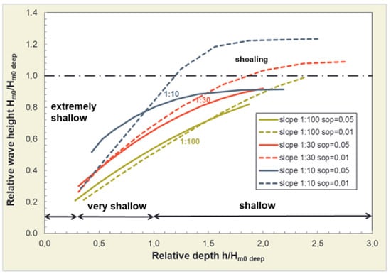 Definition of shallow foreshore zones and the effect on wave height Hm0 for various foreshore slopes and two different wave steepness levels [].