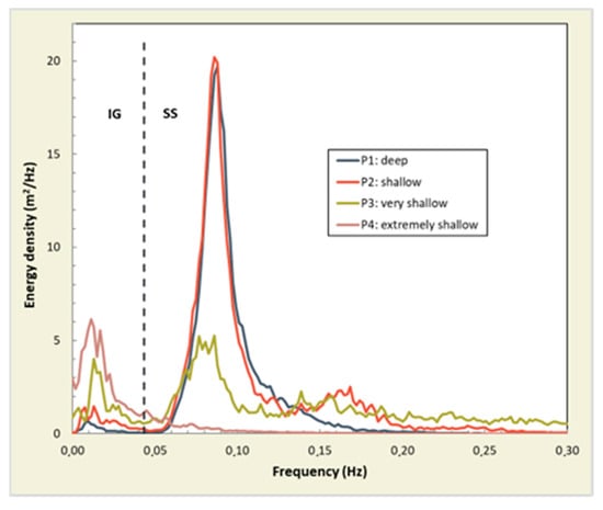 Wave spectra for the points deep to extremely shallow conditions. IG = Infragravity, SS = Sea-swell [].