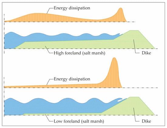Schematic presentation of energy reduction by high salt marshes in front of a sea wall (changed after []).