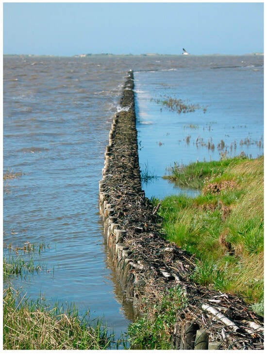 The sedimentation process can be facilitated or, in areas with hydrodynamically unfavourable development conditions, made possible by management. In this context, engineering structures, such as groynes of various designs, are extensively used along the Wadden Sea coast in order to attenuate waves and currents [,,]. According to Loon-Steensma et al. [] processes like sedimentation and succession appear to be similar to those in natural salt marshes. Bakker et al. [] found succession results in the same climax plant communities in naturally and anthropogenically created salt marshes. Arens and Götting [] state that groyne fields without an artificial drainage system are evaluated as natural.