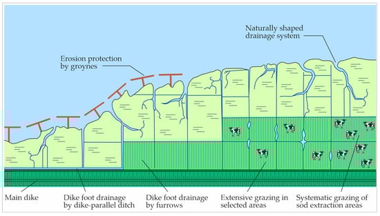 Historically, salt marshes along the mainland coast of the Wadden Sea were mainly used for agricultural purposes []. In order to expand the agricultural area in addition to the naturally occurring salt marshes, extensive new salt marshes were developed using technical measures in the past [,,]. Therefore, almost all salt marshes show effects of management []. Toward the end of the 20th century, the focus shifted as the importance of nature conservation increased [,]. However, the function of salt marshes in coastal and erosion risk management has been known for over a century and remains important today [,,,].