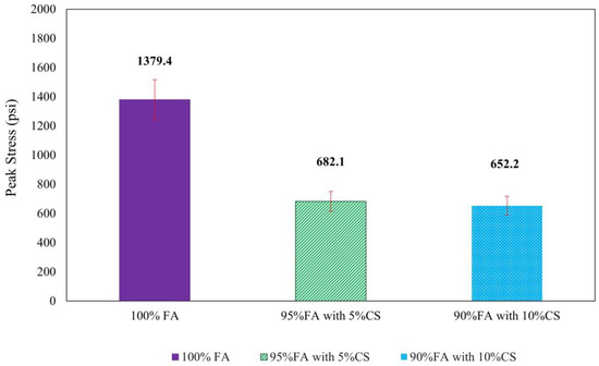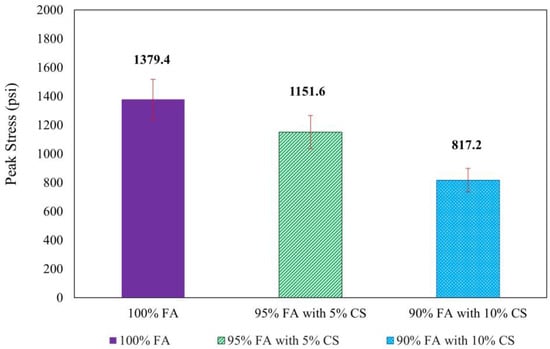 Figure 2 displays the compressive strength for the 180 μm samples, as are in Tables S1, S4 and S5. The CS-containing average strengths were 4702.9 kPa (682.1 psi) for 90% FA with 10% CS and 4496.8 kPa (652.2 psi) for 95% FA with 5% CS, with a particle size of 180 μm. The compressive strength of the lower percentage composition of CS was found to be the highest, as shown in Figure 2. However, experimental variability means that no significant difference in compressive strength can be found between the 0% and 5% CS samples.