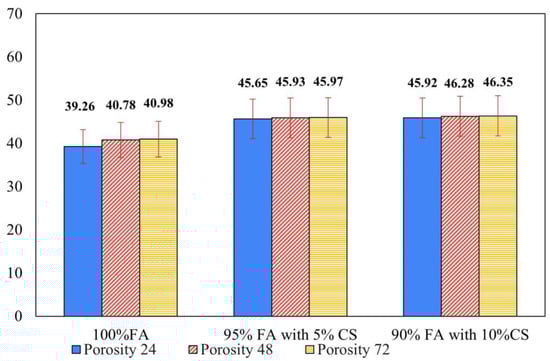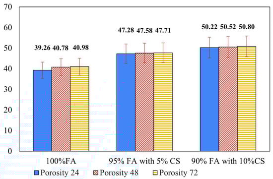 Porosity of synthesized geopolymer with and without CS (180 µm particles) at 0%, 5%, and 10% after drying for 24 h, 48 h, and 72 h.