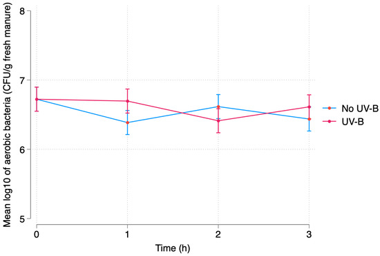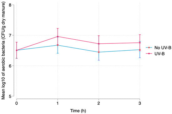 Marginal means and 95% confidence intervals of log10 aerobic bacteria (CFU per g of fresh manure) exposed to UV-B and no UV-B exposure (exposed to LED). Manure exposed to UV-B (pink) and No-UVB (blue) for 4 time points. (Table 1 with the description of times and dose).