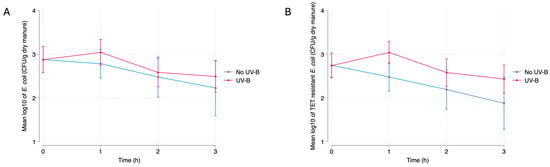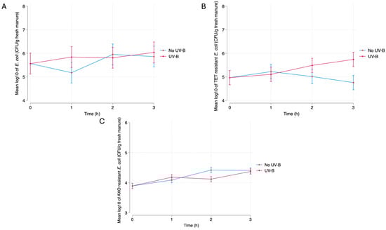 No effects were observed on total, tetracycline-resistant, or erythromycin-resistant Enterococcus spp. quantities in fresh manure exposed to UV-B. Gram-positive bacteria have natural protection against UV-B radiation due to the presence of a cell wall [80]. In the current study, the general population of Enterococcus spp. was evaluated, but potential changes in species-level populations may have occurred. It has been reported there are differences in response among Enterococcus species to UV-B [81]. For example, E. hirae has shown intermediate susceptibility compared with E. faecium, which in turn showed greater resistance to UV-B than others [81]. Additionally, previous studies have reported that the uvrA gene encoded on the conjugative plasmid pAD1 is a crucial UV resistance mechanism in Enterococcus faecalis [82]. Individual resistance has also been reported among Enterococcus spp. of the same species; for example, in a study of different strains of vancomycin-resistant Enterococcus spp. (VRE) exposed to different levels of UV-C light, it was found that some strains were ten times more resistant than others [81].