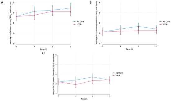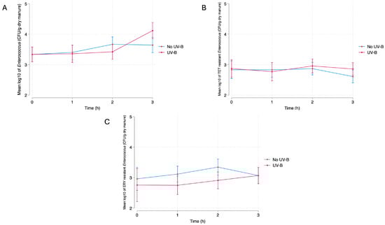 Marginal means of Enterococcus spp. log10 CFU per g of fresh manure exposed to UV-B and no UV-B exposure (LED exposure). Manure exposed to UV-B (pink) and No-UVB (blue) for 4 time points. (A) Total Enterococcus spp., (B) tetracycline-resistant Enterococcus spp., and (C) erythromycin-resistant Enterococcus spp. (Table 1 with the description of times and dose).