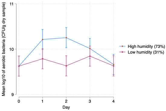 Marginal means and 95% confidence intervals of total aerobic bacteria log10 CFU per g of dry matter exposed to low humidity (31%) and high humidity (73%). Manure exposed to low humidity (pink) and high humidity (blue) across 4 days.