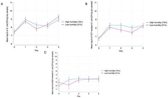 Marginal means and 95% confidence intervals of E. coli log10 CFU per g of dry matter exposed to low humidity (31%) and high humidity (73%). Manure was exposed to low humidity (pink) and exposed to high humidity (blue) for 4 time points. (A) total E. coli, (B) tetracycline-resistant E. coli, and (C) ceftriaxone-resistant E. coli.