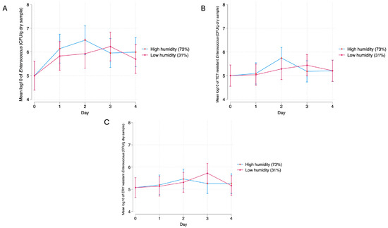 Marginal means and 95% confidence intervals of Enterococcus spp. log10 CFU per g of dry matter exposed to low humidity (31%) and high humidity (71%). Manure was exposed to low humidity (pink) and high humidity (blue) for 4 time points. (A) total Enterococcus spp., (B) tetracycline-resistant Enterococcus spp., and (C) erythromycin-resistant Enterococcus spp.