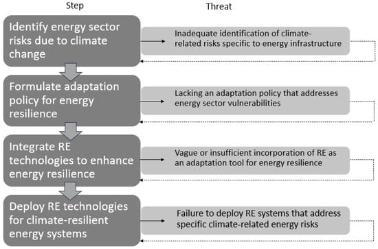 Accordingly, Figure 1 below presents the schematic policy process for implementing RE technologies as adaptation measures, specifically within the energy sector. This framework outlines how RE technologies address the risks posed by climate-related events like floods, fires, and extreme weather. The process begins with identifying energy sector-specific risks caused by climate change, with the associated threat being the failure to adequately identify climate-related risks specific to energy infrastructure. The second step involves formulating an adaptation policy focused on energy resilience, where the threat lies in the failure to address energy sector vulnerabilities comprehensively. The third step emphasizes integrating RE technologies into the adaptation policy to enhance energy resilience, with the threat being vague or insufficient incorporation of RE as a tool for energy adaptation. The final step entails the actual deployment of RE technologies to build climate-resilient energy systems, with the threat being the failure to deploy RE systems that specifically address identified climate-related energy risks. As can be seen, if a particular climate threat materializes, it necessitates revisiting the corresponding policy step to ensure that RE is effectively implemented for climate change adaptation in the energy sector.