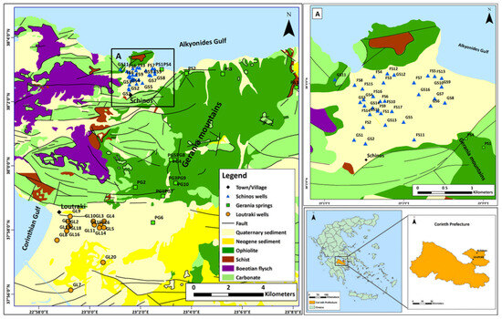 A simplified geological map of the study area [34,35] with the groundwater sampling sites. An enlarged image of the Schinos area is given in (A) [30].