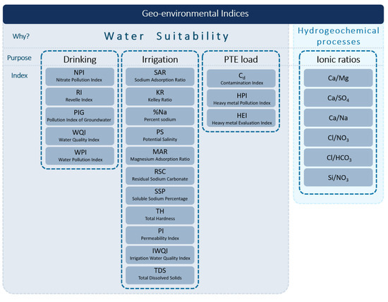 The suitability of water is directly related to its intended use. Numerous geo-environmental indices are available to evaluate water quality for different purposes; several of those used in this study are shown in Figure 2. In general, these indices offer valuable information on water suitability (e.g., for drinking or irrigation), water quality assessment (e.g., PTEs and other major/minor elements), and the identification of key hydrogeochemical processes (e.g., contributions from geological formations, anthropogenic activities, and geochemical reactions) (Figure 2).
