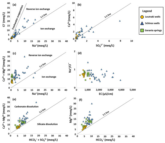 The groundwater samples from the study area exhibit alkaline (pH ≥ 7.45; from 7.45 to 9.64) and oxidizing (Eh ≥ 231 mV; from 231 mV to 371 mV) geochemical conditions [30]. The EC values range from 316 μS/cm to 3943 μS/cm, while DO values vary from 3.62 mg/L to 13.49 mg/L [30], suggesting the influence of diverse hydrogeochemical processes on groundwater quality. Previous studies have identified factors/processes such as seawater intrusion [28,29,30] and initial stages of denitrification [30] as potential contributors to these variations. More information about the descriptive statistics of the above-mentioned dataset is presented in the study by Papazotos et al. [30]. The Schinos area consistently showed the lowest pH values, while the highest were observed in the springs of the Gerania Mts. The groundwater was predominantly classified as Mg-HCO3 water type, which indicates rainwater–ultramafic rock/soil interaction, as confirmed by the Piper plot presented in our previous work [30]. In the Loutraki area and Gerania Mts., Mg2+ concentrations among major cations exceeded those of Ca2+ or alkali (Na+ + K+), whereas Schinos displayed both high Mg2+ and alkali levels. Regarding major anions, HCO3− predominated in the region, followed by Cl−, with the samples of the Schinos area showing elevated Cl− concentrations. The main hydrochemical types were Mg-HCO3, Mg-Cl, and Na-Cl, with samples of the Schinos area suggesting possible seawater intrusion due to increased Na+ and Cl−; these results are in agreement with previous studies in the same area (e.g., [28,29,30,33]). Bivariate diagrams were employed to further explore these hydrogeochemical relationships (Figure 3). The strong linear correlations observed between Na+ vs. Cl−, as well as Ca2+ vs. SO42−, indicate a shared origin for these ions, evidenced by their alignment along the theoretical 1:1 line associated with halite and gypsum dissolution (Figure 3a,b). The samples from the Schinos area exhibited notably higher groundwater concentrations of dissolved ions. This alignment strongly suggests that seawater intrusion plays a major role as a driving geochemical process in the study area. Additionally, the majority of the samples exhibited a minor deviation, plotting above the 1:1 line in the Ca + Mg vs. Na plot (Figure 3c). This pattern underscores the importance of reverse cation exchange as a significant geochemical process, marked by a decrease in Na+ and an increase in other major cations, particularly Ca2+ and Mg2+ [89,93]. In Figure 3d, a slight decrease in the Na+/Cl− ratio is observed as EC increases, further supporting the presence of a seawater intrusion regime in the Schinos area, where EC values reached up to 3943 μS/cm [30]. The presence of Mg2+ in groundwater is primarily associated with the abundance of Mg-bearing silicate minerals found in ultramafic rocks in the study area [30,31], such as those in the olivine (e.g., forsterite [Mg2SiO4]), and pyroxene (e.g., enstatite [Mg2Si2O6]) groups, as well as secondary minerals such as the serpentine group [Mg3Si2O5(OH)4] and talc [Mg3Si4O10(OH)2]. Additionally, significant contributions of Mg2+ result from the dissolution Mg-rich carbonates, including magnesite [MgCO3], hydromagnesite [Mg5(CO3)4(OH)2·4(H2O)], huntite [Mg3Ca(CO3)4], and pyroaurite [Mg6Fe3+2CO3(OH)16·4H2O] [94], a process that may explain the observed predominance of HCO3− + SO42− over Ca2+ + Mg2+ (Figure 3e). This process can be represented by the following dissolution reactions for magnesite (Equation (30)) and forsterite (Equation (31)), which also apply to other relevant mineral phases: