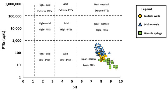 A total of 68 groundwater samples were collected from the study area: (i) 33 from irrigation wells in the Schinos area, (ii) 15 from Gerania springs, and (iii) 20 from drinking and irrigation wells in the Loutraki area. Sampling occurred during two campaigns in November 2016 and June 2017. Well samples were collected after purging residual water for at least 15 min, while spring samples were obtained via natural discharge. Water was collected in pre-cleaned 1000 mL polyethylene bottles, which were rinsed with sample water before collection. Samples were divided into three subsamples: 500 mL for major cations (Ca2+, Mg2+, Na+, K+) and anions (Cl−, SO42−, HCO3−, NO3−, PO43−) 100 mL for PTEs and other trace elements (e.g., As, Cd, Cr, Ni, Si, Pb, Zn, etc.); and 25 mL for Cr(VI). Physical parameters such as electrical conductivity (EC), dissolved oxygen (DO), pH, and oxidation–redox potential (ORP/Eh) were measured in situ using a YSI Professional Digital Sampling System (ProDSS). Samples were stored in a cooler and refrigerated at 4 °C prior to analysis. The 500-mL subsamples were filtered and analyzed within 8 h to determine the dissolved forms of major ions. Major ions were determined using atomic absorption spectrometry (AAS), titration, spectrophotometry, or turbidimetry, while PTEs, other trace elements, and Cr(VI) were measured by inductively coupled plasma mass spectrometry (ICP-MS). All analyses followed international quality control protocols—using blanks, standards, and duplicate samples to maintain charge balance errors within ±10%—and were conducted in an ISO/IEC 17025:2005 (UNE-EN ISO/IEC/17025:2005, 2005 [48]. General Requirements for the Competence of Testing and Calibration Laboratories) certified laboratory, ensuring high precision, accuracy, and reliability. The data of this study were previously published in our earlier research [30], which also provides detailed information on the sampling and analysis procedures.