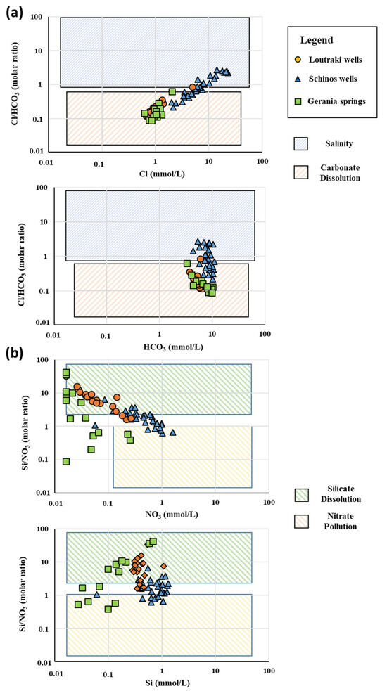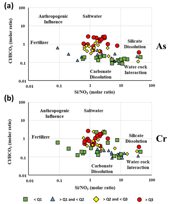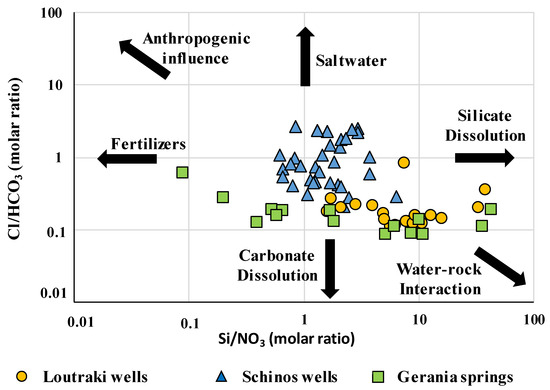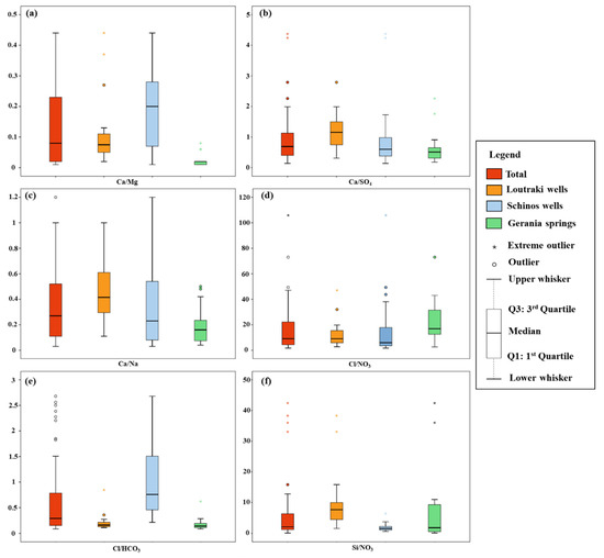 Groundwater quality was evaluated using various ionic ratios, including Ca/Mg, Ca/SO4, Ca/Na, Cl/NO3, Cl/HCO3, and Si/NO3. Each ionic ratio offers insights into underlying hydrogeochemistry, such as the origin of water from specific geological formations, various geochemical processes, anthropogenic influences, etc.