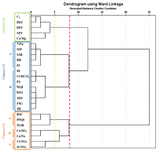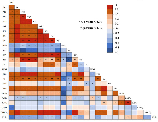 Permeability index (PI): PI is used to assess and classify the quality of irrigation water. Long-term irrigation can impact soil permeability, which is influenced by the concentrations of Na+, Ca2+, Mg2+, and HCO3− in the soil. Doneen [63,64] proposed Equation (22) (with all ion concentrations expressed in meq/L) to calculate PI: