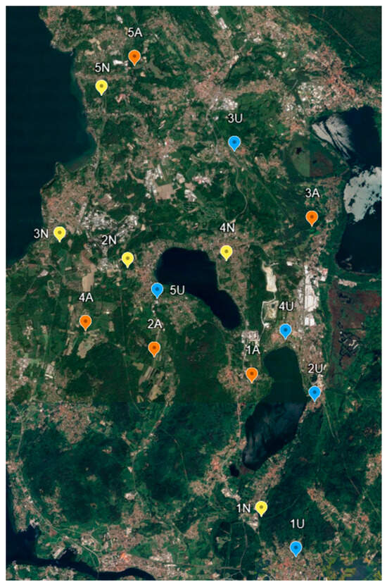 For this study, a total of 15 soil samples were collected, representing three different land uses: natural (N), agricultural (A), and urban (U). Samples were taken from a depth of 0–15 cm and reflect the region’s uncontaminated soils, all exhibiting a very low and consistent natural tungsten concentration of approximately 0.10 mg/kg. The sampling points are reported in Figure 1.