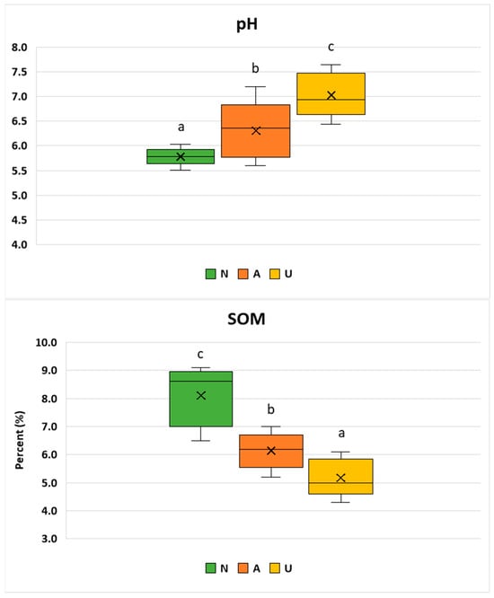 Boxplots representing the distribution of pH values and organic matter content in the soils from different land uses, with central lines marking the median values. Values followed by different lowercase letters are significantly different at p < 0.05.