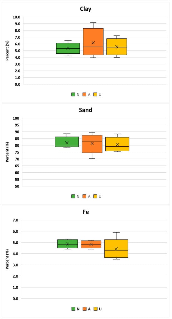 A soil texture analysis revealed a predominance of the sandy fraction, with values ranging from approximately 70% (5A) to 89% (1N), and an average of around 81%. Unlike pH and organic matter, the soil texture and total Fe content appear to be minimally influenced by land use. Figure 3 illustrates that no statistically significant differences are observed among the texture and Fe content values. The inclusion of Fe content in the analysis is due to the role of Fe oxides and hydroxides, which possess high specific surface areas and are considered critical in tungsten sorption processes [].