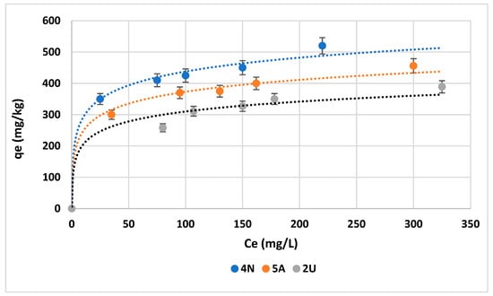 The sorption isotherms for the different soil uses are reported in Figure 4. The data refer to the soil with the highest qmax for each land use.