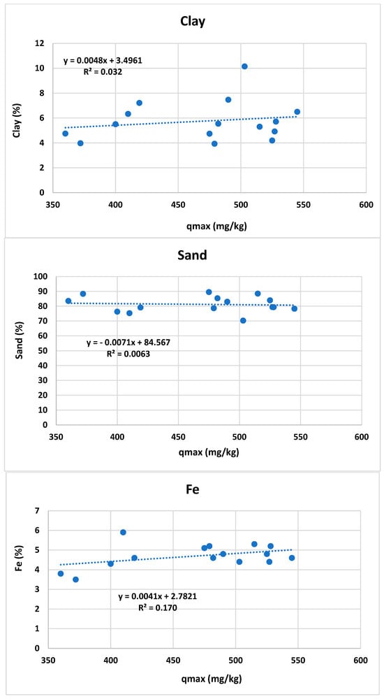 Other soil parameters, such as clay, sand, and Fe content, show weaker correlation within individual land use categories. The absence of a correlation between total Fe content and qmax may be due to the relatively uniform Fe content across all 15 soil samples, making it difficult to isolate its specific contribution to the sorption process.