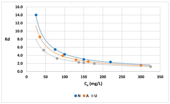 Kd trends of N, A, and U soils versus equilibrium concentrations (Ce).