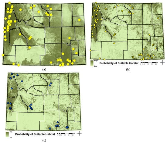 Seven top variables were identified for the sampling SDM from the 25 variables evaluated. Past (1910–2010) observations of B. occidentalis were mainly in mountainous areas of Wyoming (Figure 2a) potentially explaining why suitable habitat was most influenced by mean forest cover, precipitation of coldest quarter (snowpack), isothermality (temperature evenness), mean herbaceous cover, mean temperature of wettest quarter, precipitation of wettest month and precipitation seasonality (area under the curve; AUC = 0.87). The model predicted a relatively even proportion of Wyoming that had predicted low (34.3%), medium (32.8%) and high (32.9%) habitat suitability.