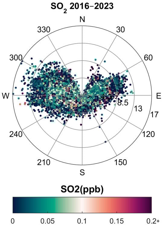 In integrating the data shown in the wind rose based on 2016–2023 hourly averages (Figure 2), which is thus representative of eight years of local wind circulation at the LMT, a total of four seasonal wind rose scatter plots of SO2 are shown in Figure 4. These plots, which integrate the daily cycle evaluations seen in 3.1, show SO2 concentrations from the western–seaside wind corridor at wind speeds higher than their northeastern–continental counterparts. Supplementary Materials S1A–H cover seasonal patterns in each year between 2016 and 2023.