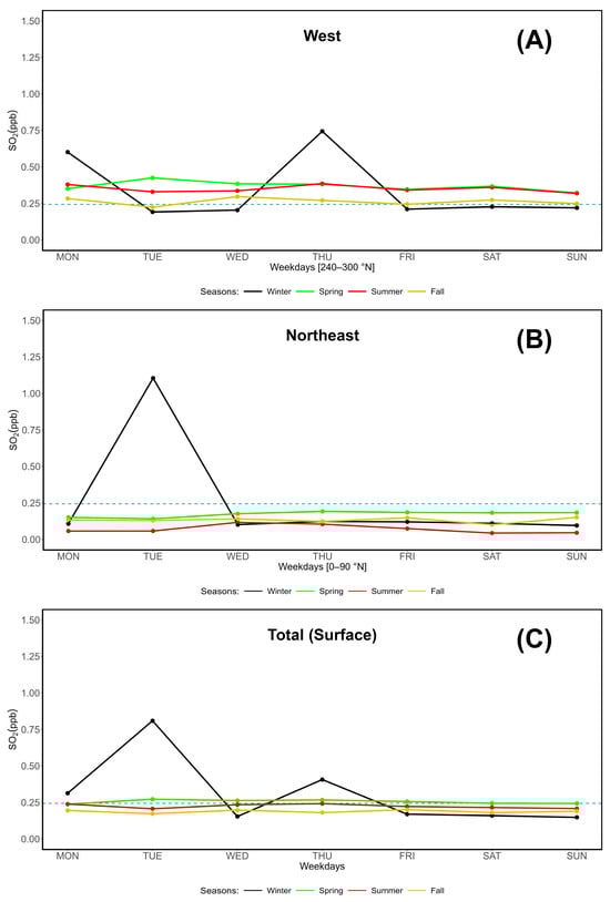 Multi-year evaluations of compounds at the LMT have also been conducted on the weekly cycles as possible indicators of natural vs. anthropogenic sources [78,79,100]. In the case of SO2, considering the implementation of satellite data that were not used in similar research studies on the LMT, weekly cycles were assessed and are shown in Figure 6. Supplementary Materials S3A1–H3 cover surface data at the LMT from each year within the entire 2016–2023 observation period.